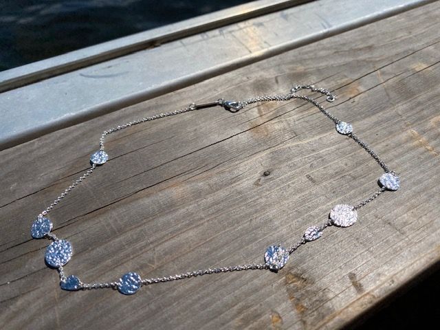 The MARGARITTE HAMMERED NECKLACE has stamped silver circles in various sizes. It has 3 options for length so it can be worn as a choker but also a bit longer. ($32)