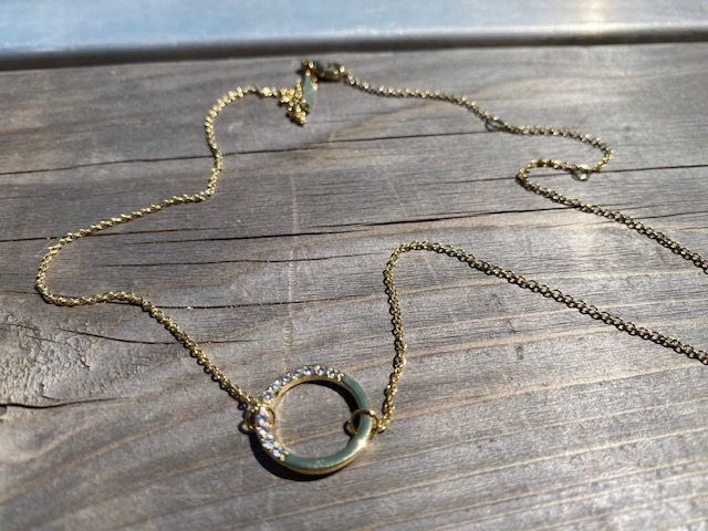 The NATALIE NECKLACE is the circle in the center and is delicate against your neck. Again, the necklace is versatile with 3 options for length so it can be worn as a choker but also a bit longer. ($32)
