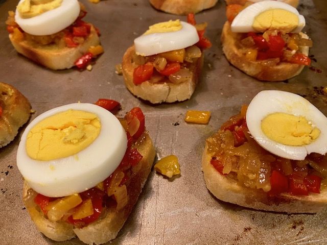 For our appetizer we made Slata Mechouia, a bruschetta-like app that has a lovely mix of bell peppers, onions, and tomatoes. The boiled egg on top makes it an unexpected treat.