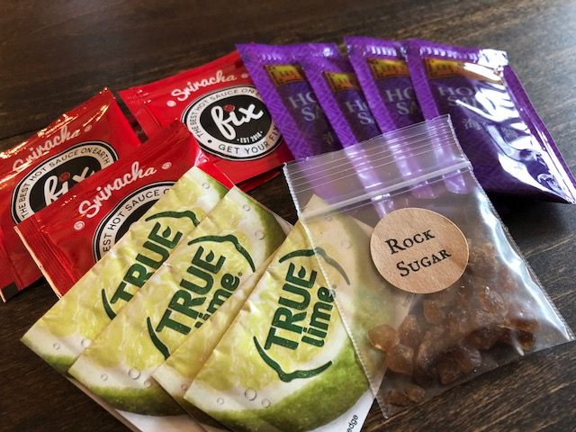 Sriracha chili sauce, hoisin sauce, rock sugar, and lime juice packets