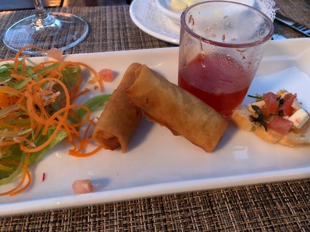 We began our meal with bruschetta made with tomato, mozzarella, and basil and vegetarian spring rolls served with sweet chili sauce.