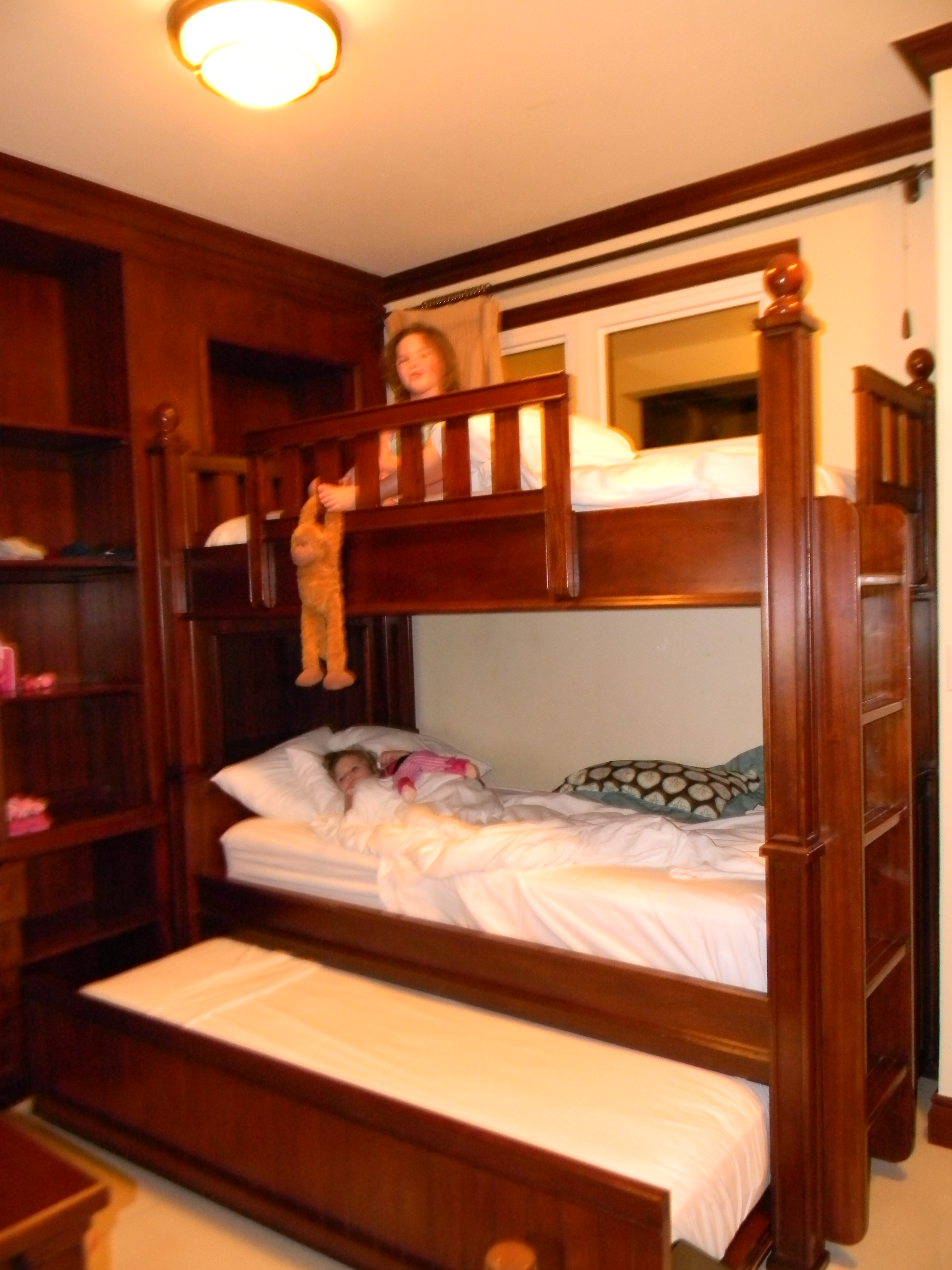 We stayed at the Italian village both times because we loved it so much and there was plenty of space for everyone to spread out. We stayed in an Italian oceanfront walkout family suite with a kid’s room. The kid’s room was amazing. It had fabulous bunk beds and a television with an Xbox with tons of games. The bunk beds included a trundle so you could fit more children in that room if needed. At the time our youngest was in a phase where she was falling out of bed a lot so it was great to have the trundle bed to catch her fall from the bottom bunk. The master bedroom had a king size four poster bed and a couch that also had a pull-out trundle. The master bedroom had a slider that led to a patio with chaise chairs. The room had a huge bathroom with a large soaker tub that was great for bathing the kids. Housekeeping was wonderful. They did a thorough cleaning job and my girls loved coming back to the room and seeing the animals created with our towels and fresh flowers.