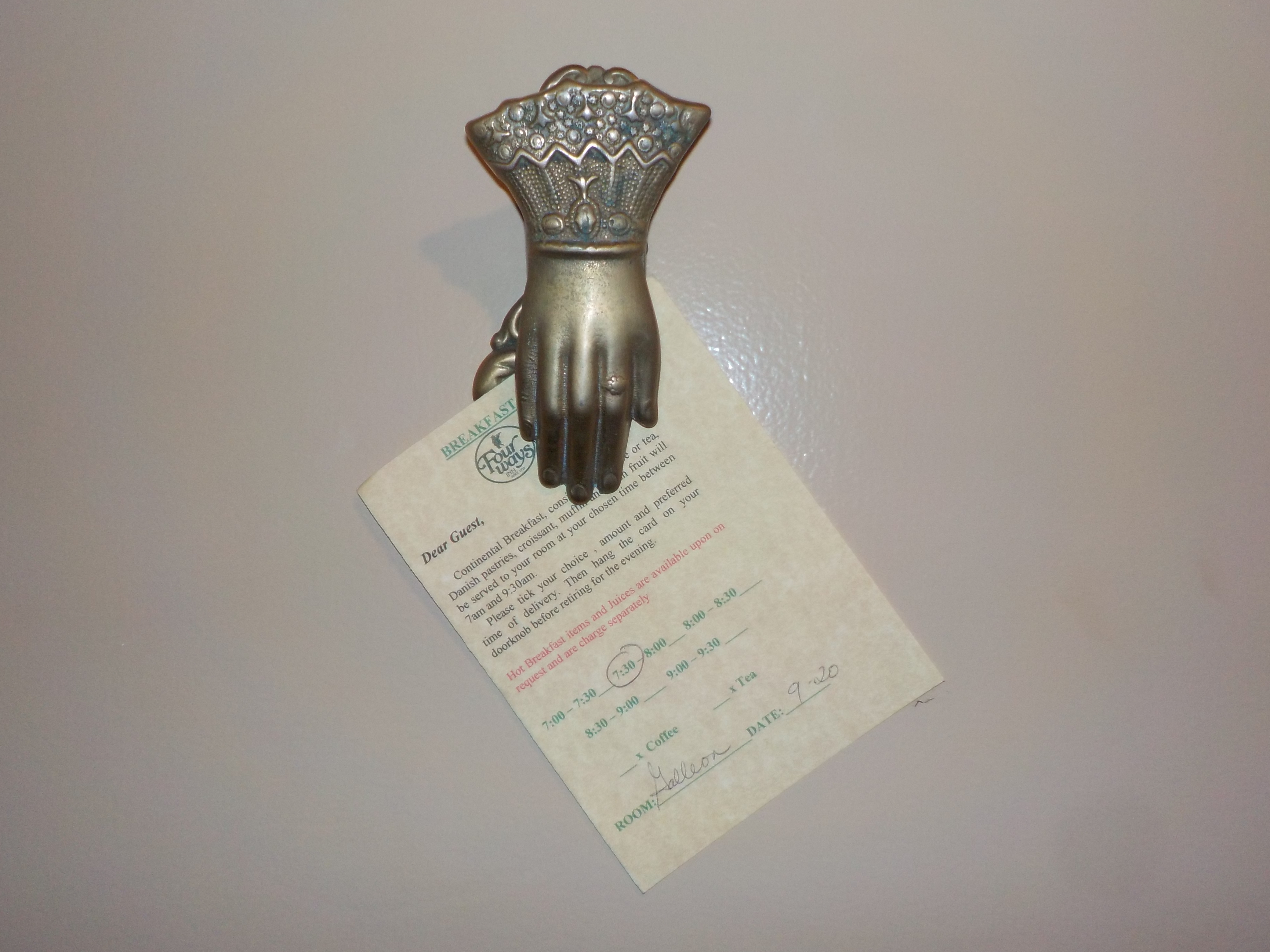 A perk about staying in a smaller place is the extra attention they can pay their guests. The Fourways Inn does a wonderful job with individual attention. Every day you choose what time you would like breakfast and you place it on your door under this adorable hook.