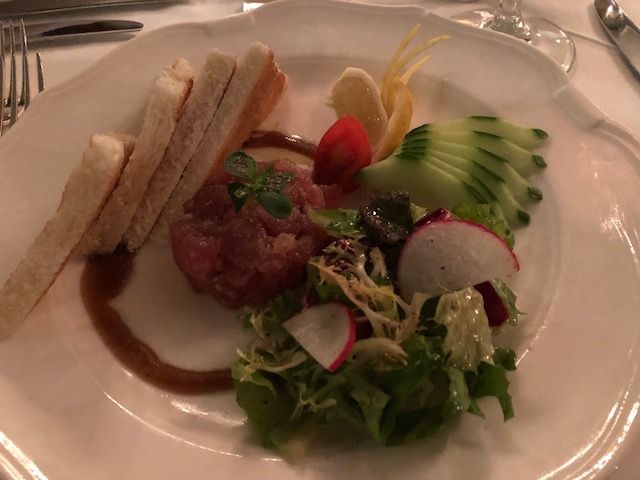 The menu is French cuisine alongside island flair. They use only the freshest seasonal ingredients. For example, the fish is caught daily and herbs are gathered right from the property. We had a wonderful meal here on our first night. We started with tuna tartar.