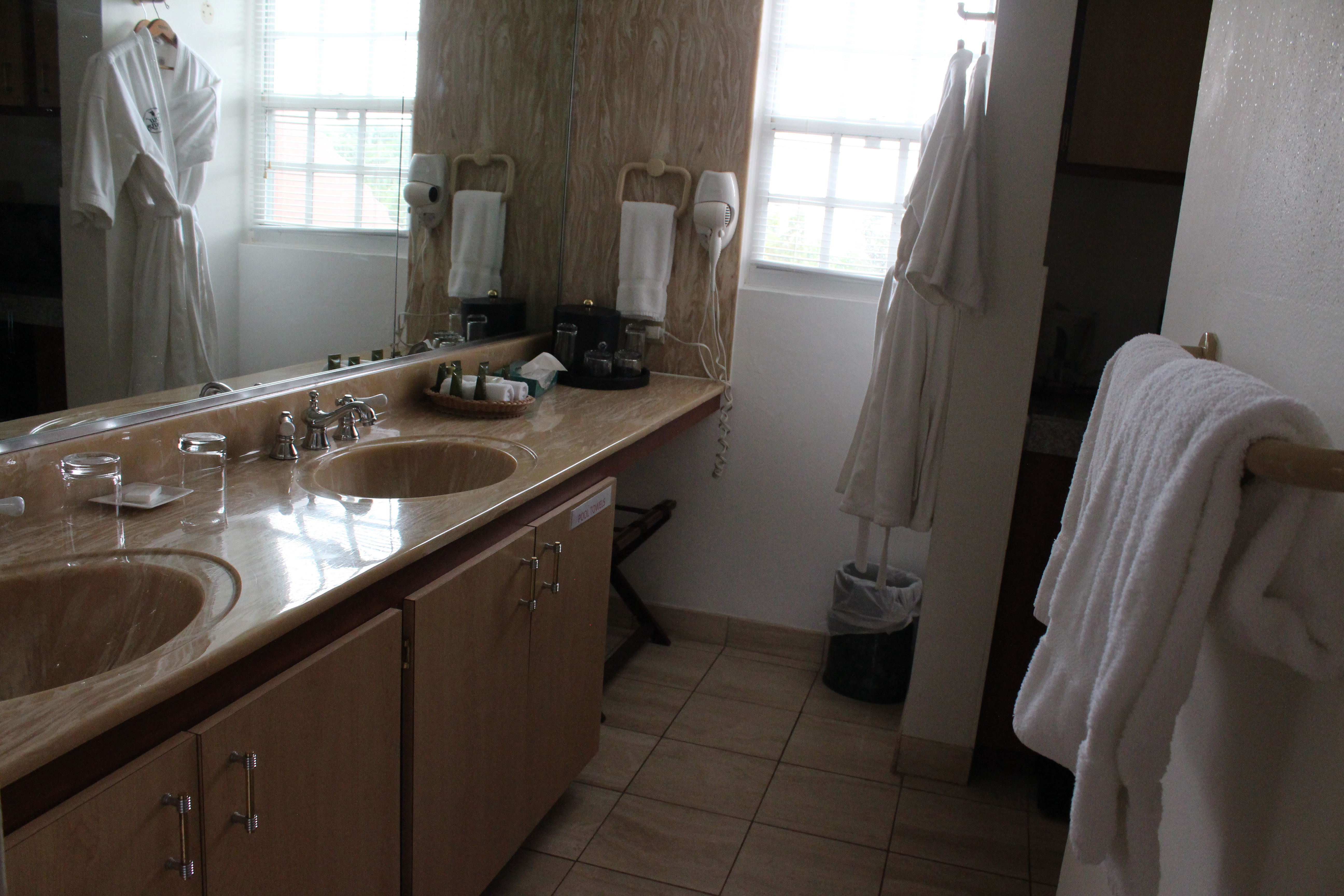 The room included lots of extras like a blow dryer, flat-screen tv, and even cozy bath robes. The bathroom had a separate shower and a 2-sink vanity.