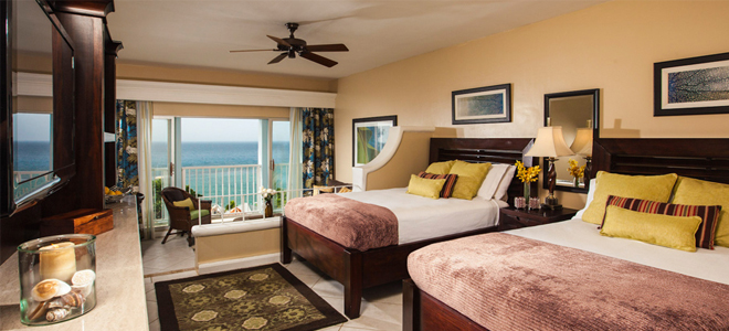 We stayed in a Caribbean Honeymoon Oceanview Concierge Veranda Suite Double. These large suites were the perfect family retreat since everyone had their own space. The room was decorated in Caribbean decor with lots of natural light. The room featured traditional mahogany furniture, including two double beds. It also had a flat screen television, ceiling fan, air-conditioning, coffee/tea maker, electronic safe, iron and ironing board, and microwave. There was also a mini fridge that was stocked daily with complimentary water, beer, soda, and juice. I wish we could have turned the temperature of the fridge down because the drinks were not very cold. The room also had a bottle of both red and white wine as well as a bottle of champagne.