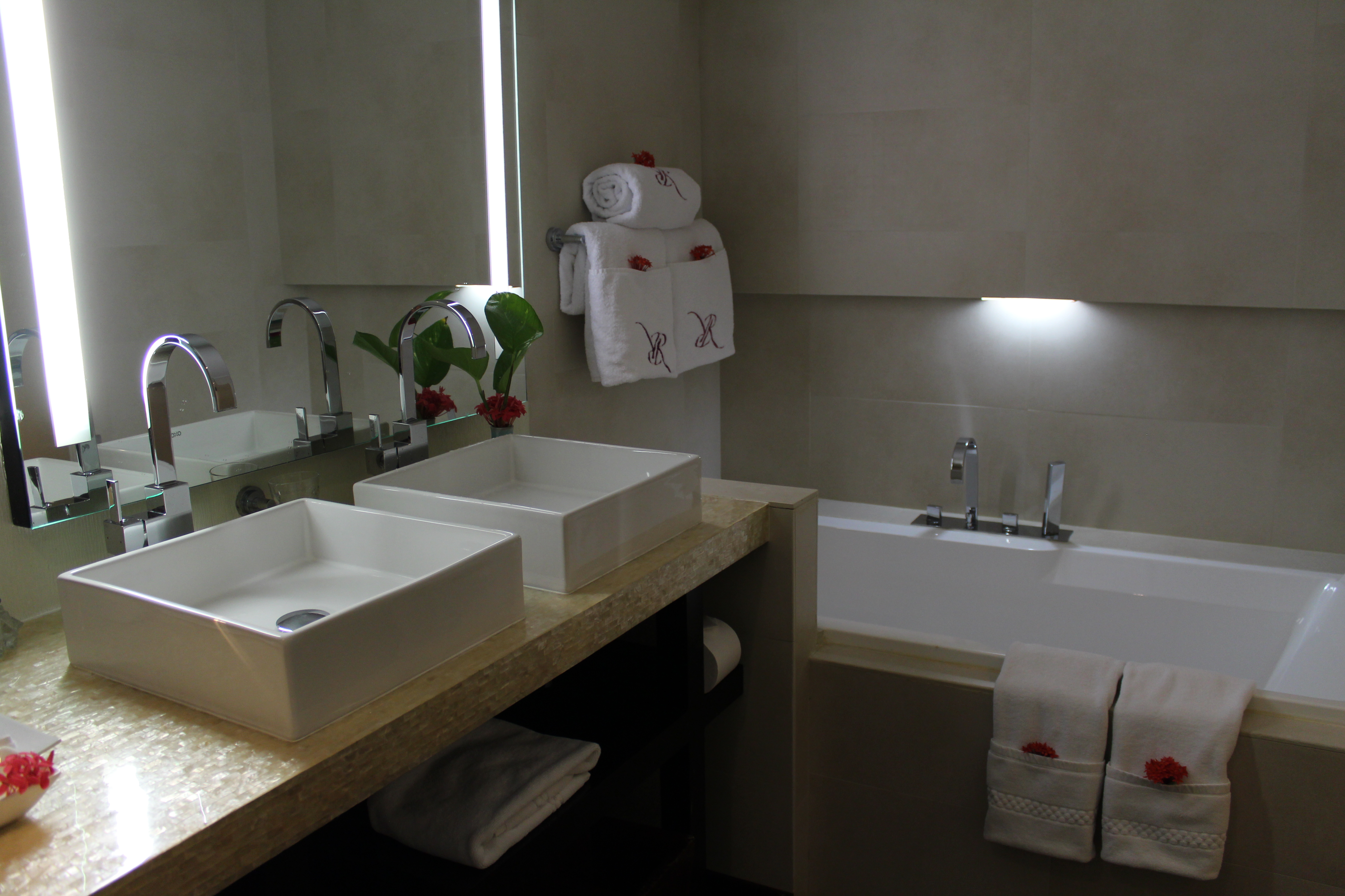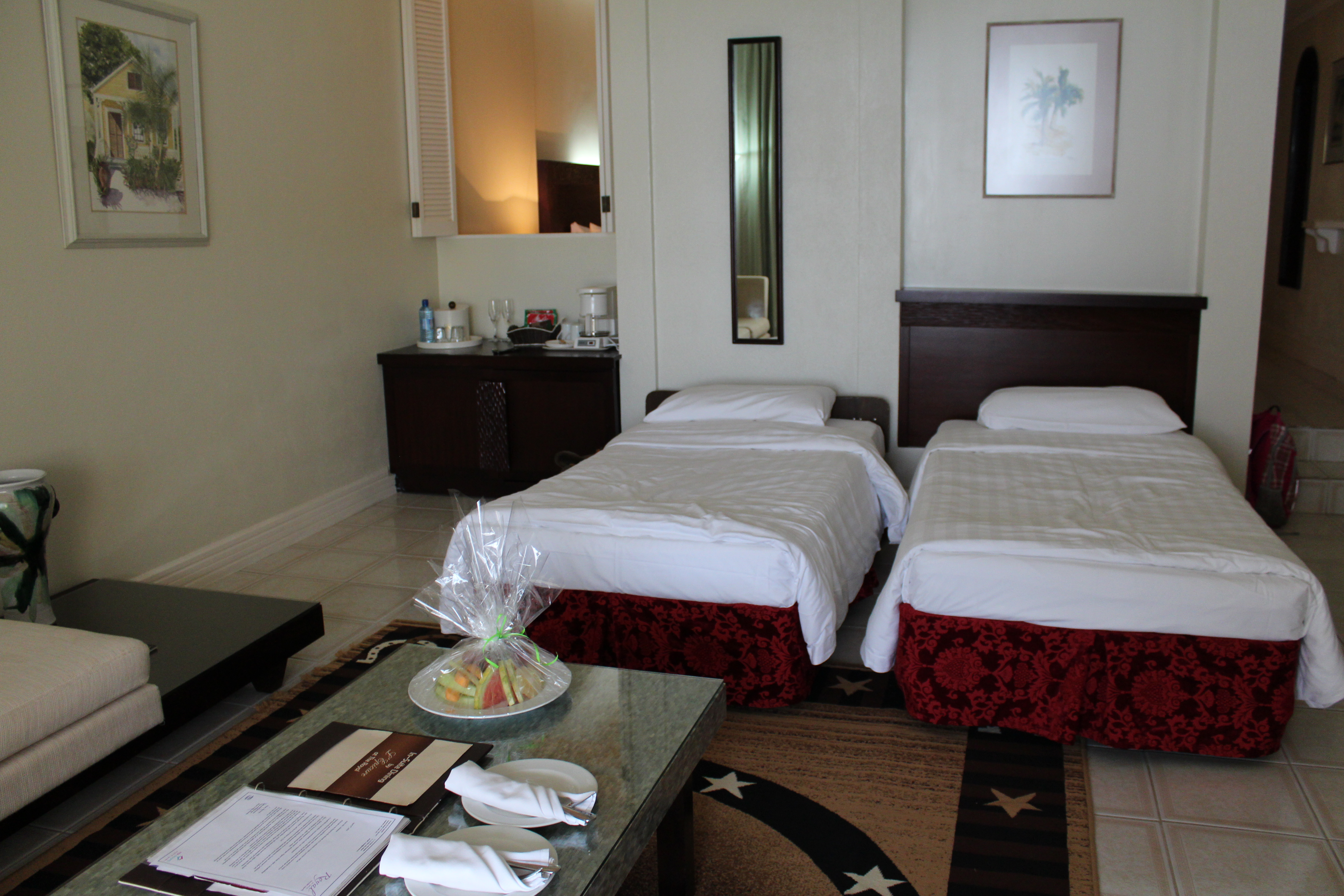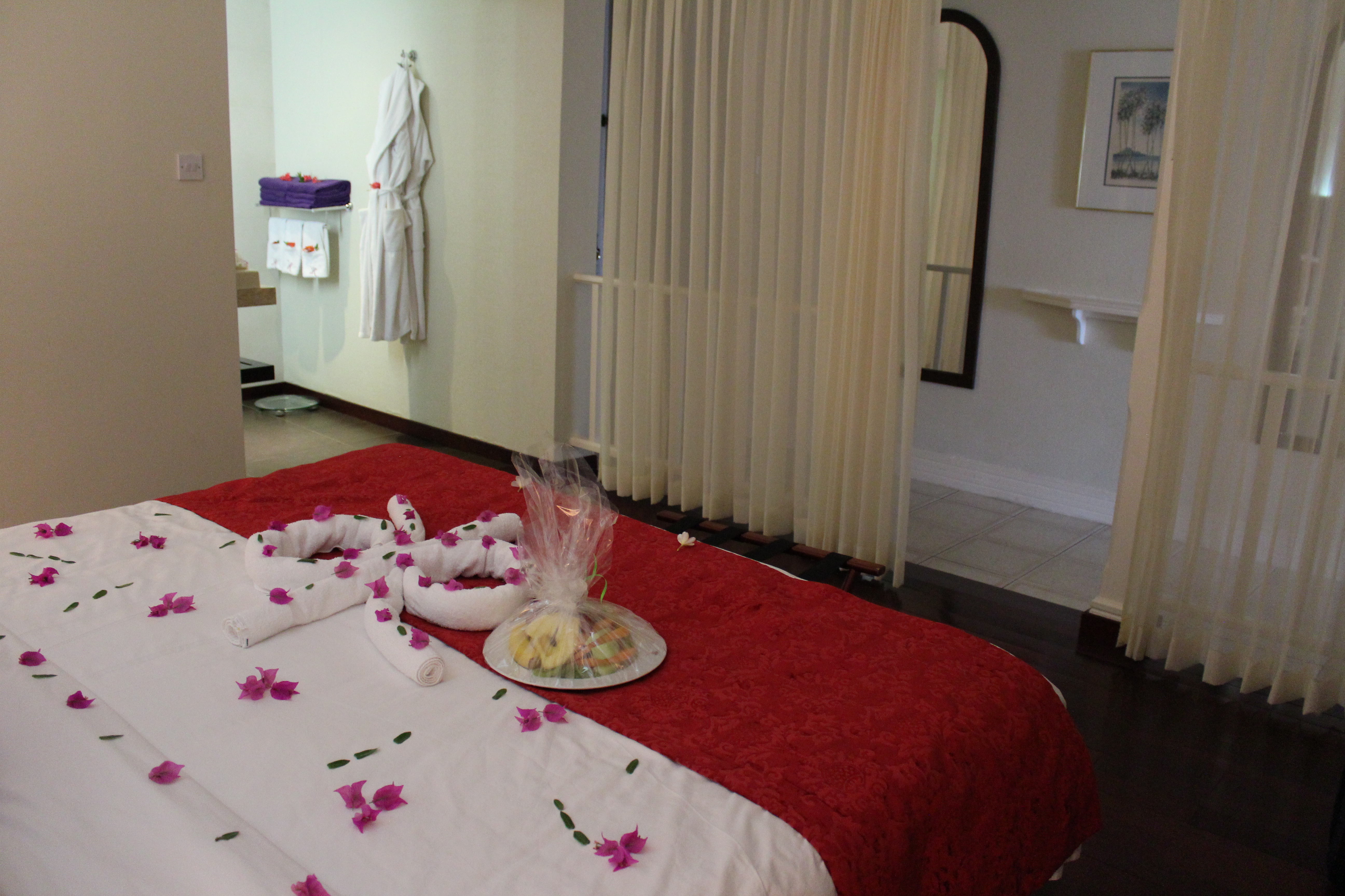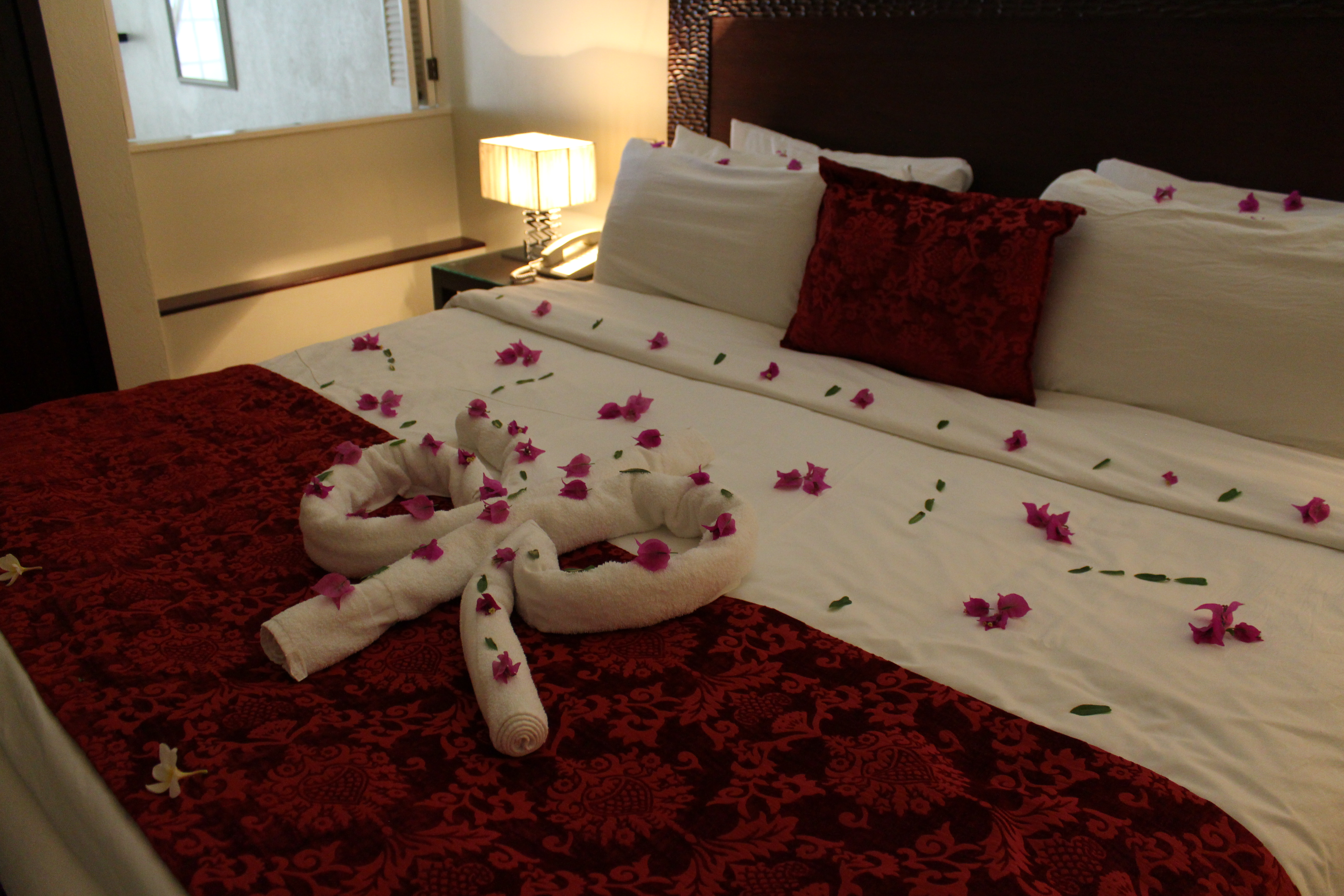 When we walked into our suite we were in awe of the size. Sheer curtains framed the entrance to the bedroom. The bed was beautifully decorated with petals and the bathroom had flowers on all the towels and counters. It was breathtaking. The living room was set up with two comfortable twin beds and was spacious enough so everyone had room to spread out. I was expecting some cots thrown in our room but the girls loved having their own room.