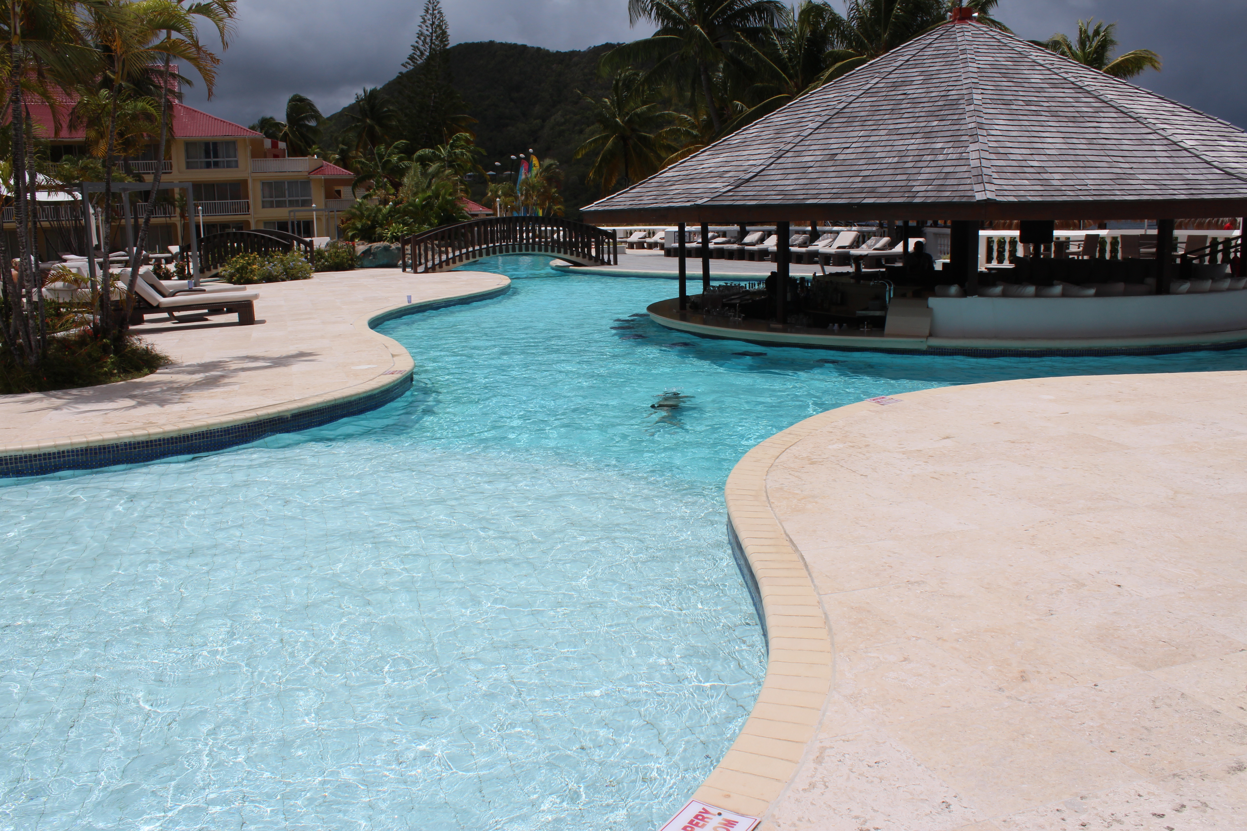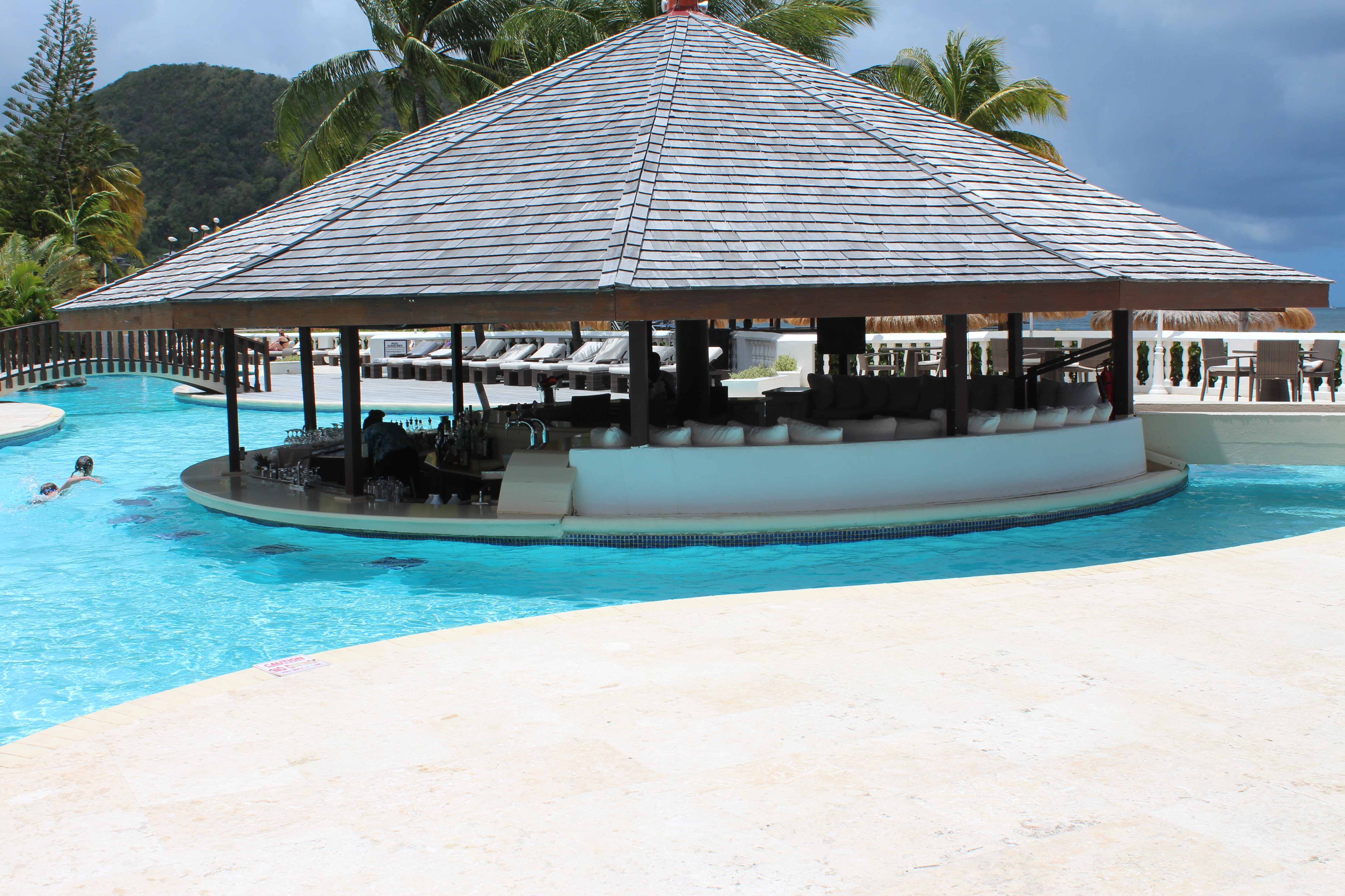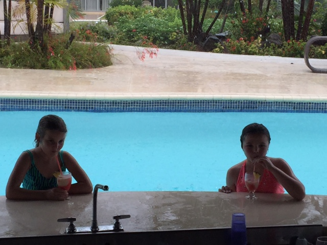 The hotel has a gorgeous pool just steps from the beach. The swim-up bar is a favorite among the hotel guests. There is a section where you can walk into the bar without getting wet and couches line the edge. There are stools in the water so you don’t have to leave the cool water to get a drink. They had a great selection of cocktails and my girls especially liked their fruit smoothies. The afternoon we arrived was raining but the girls still wanted to swim so my husband and I sat in the bar area while the girls swam around us. It was the best of both worlds. Troy was the friendliest bartender and he made everyone laugh. He was so good to the girls (even after one of them spilled their smoothie minutes after he made it.) We all loved the pool and swam in it throughout the day. There are covered bridges you can swim under and a rock formation in the deep end where you can sit. There were times when we were the only ones in the pool. The staff was meticulous in cleaning it each day.